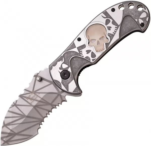 Type: Assisted Opening; Closed: 4.75"; Blade: 3.5" l Stainless l Partially Serrated Edge l Brushed Finish; Handle: Stainless; Other Info: Thumb Stud(s) l Thumb Ridge l Pocket Clip l Lanyard Hole l Extended Tang. Brushed finish handle with glow-in-the-dark skull inlay. Boxed.