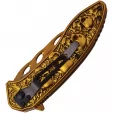Skull Linerlock. Assisted opening. 4.75" closed. 3.5" gold titanium coated stainless drop point blade. Gold anodized aluminum handle. Extended tang. Pocket clip. Lanyard hole. Skull handle artwork. Boxed.