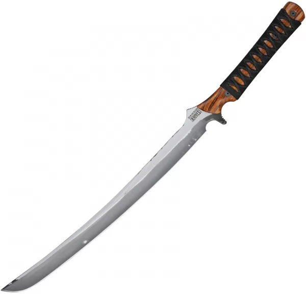 The Dawson Knives Relentless Sword, model BRK-DW14, is a formidable 14-inch blade crafted for demanding tasks. This robust sword provides exceptional cutting power and durability, built with premium materials and expert craftsmanship you expect from Dawson. Its balanced design lends itself to powerful swings, making it an ideal tool for clearing brush, heavy-duty chopping, or self-defense. The Relentless Sword offers a secure grip and enduring performance, ready to withstand rigorous use in any environment. 22" overall. 14" Hamon finish CPM-3V carbon steel blade. Ironwood handle. Full tang. Black synthetic silk wrapped handle. Black Kydex and brown leather scabbard. Boxed.