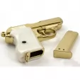 7.13" overall. Brass finish metal construction. Imitation ivory grips. Simulated mechanism of charging and firing. Removable magazine. Boxed.