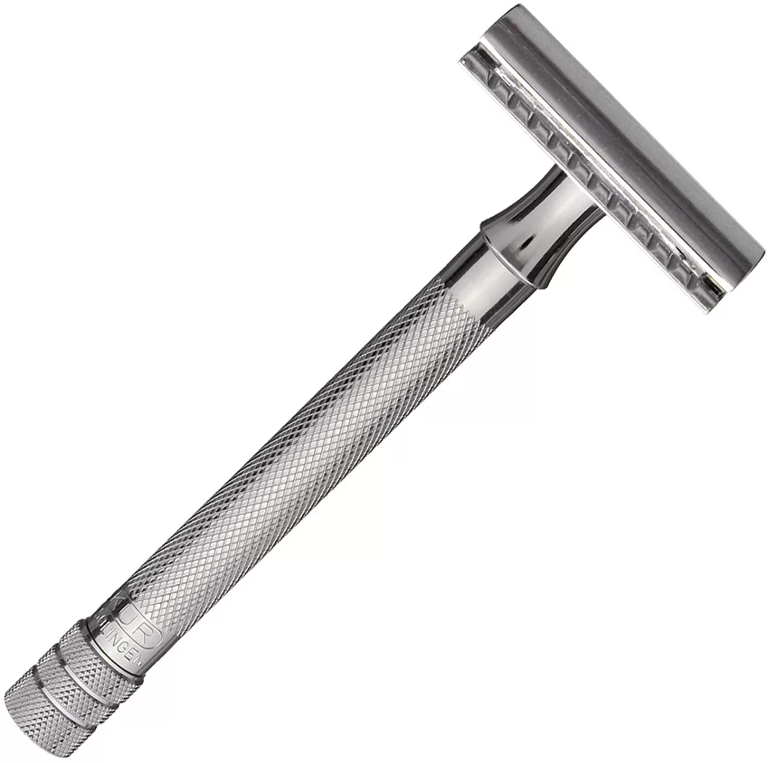 4" overall. 1 1/2" double edge shaving head. Chrome plated construction with knurled handle. Comes with one replaceable blade. Weighs approximately 2.3 oz.