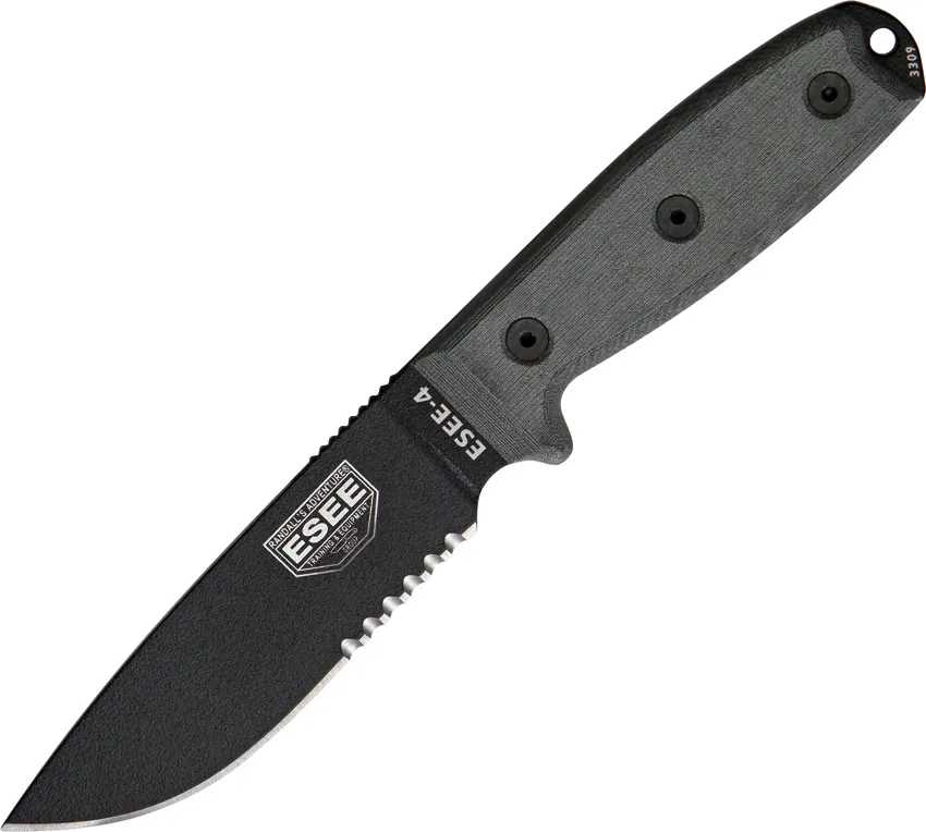 ESEE ES4SKO Item Description:Esee Knives Model 4 Serrated Edge Black Blade ,Grey Linen Micarta Handles Knife Only 9" overall. 4.5" black powder coated partially serrated 1095HC steel blade. Black micarta handle. Full, extended tang. Lanyard hole. Knife only.