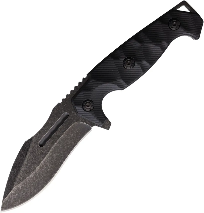 9.5" (24.13cm) overall. 4.25" (10.8cm) black stonewash finish 420C stainless blade. Black sculpted ABS handle. Full, extended tang. Lanyard hole. Black nylon belt sheath. Boxed.