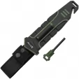 11" (27.94cm) overall. 5.5" (13.97cm) satin finish 8Cr13MoV stainless blade. Green nylon handle with black rubber overmold. Full tang. Lanyard hole. Sheath features a fire starter and sharpener. Black nylon belt sheath. Boxed.