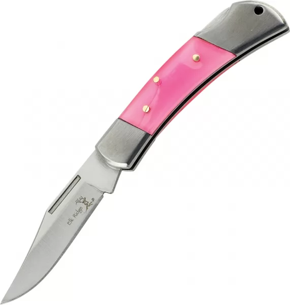 Elk Ridge ER125PK Item Description:Introducing the Elk Ridge Lockback Pink knife, model ER125PK, a compact, yet versatile tool perfect for everyday carry. Its 3.11-inch 420 stainless steel blade offers a sharp, durable cutting edge that easily tackles various tasks. The pink nylon handle adds a vibrant touch and provides a secure and comfortable grip. Featuring a secure lockback mechanism, the Lockback Pink ensures safety during use and quickly deploys with the convenient thumb stud. Whether you're tackling daily tasks, outdoor adventures, or simply need a reliable cutting tool, the Elk Ridge Lockback Pink is a must-have. Lockback. 3" closed. 2.25" satin finish 440 stainless clip point blade. Stainless handle with pink acrylic insert. Lanyard hole. Boxed.