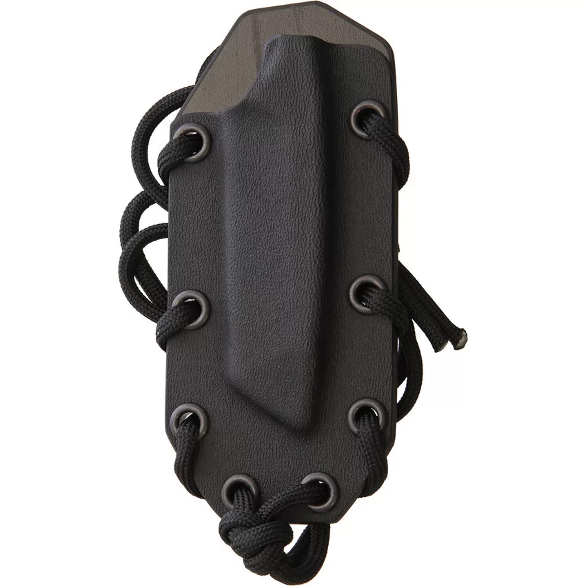 6.75" overall. 2.75" tanto blade. Finger ring. Glass breaker. One piece black MIL-C-13924 burnished Bohler N690 stainless construction. Black Kydex neck sheath. Boxed.