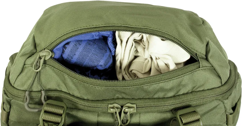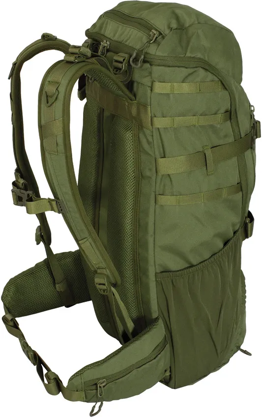 Dimensions: 24.8" x 12.25" x 10.25". 40 liter capacity. Large main compartment. Top zippered stash pocket. Front zippered large pocket. Front zip quick access to front compartment. Low profile front pocket. (2) elastic side pockets. Adjustable, padded shoulder straps. Adjustable, padded hip belt with zippered pockets. Bottom zip compartment with access to main. Airmesh padded back system. Hydration pocket with pass through port. Color: OD Green. Bulk packed.