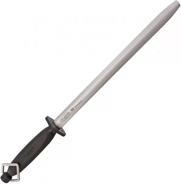 Fallkniven's D12 Pro Diamond Steel BRK-FND12PRO offers superior sharpness restoration for your blades. This professional-grade sharpener features a durable diamond-coated steel rod and a comfortable handle, enabling precise edge maintenance in the field or at home. The D12 Pro quickly and effectively refines dull edges, maintaining optimal cutting performance for your Fallkniven knives and other fine cutlery. Its compact design makes it easily portable, ensuring your knives are always ready for action. 17.75" overall. 12" oval D12 diamond steel rod. Black polyamide handles with silver composition hanging ring.