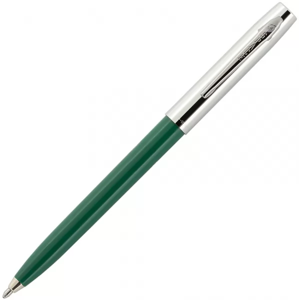 5.13" overall. Pocket clip. Fisher PR4 black ink, medium point cartridge. Chrome cap. Green barrel. Write upside down, at any angle, underwater, over grease, and in extreme temperatures. Hang packaged.