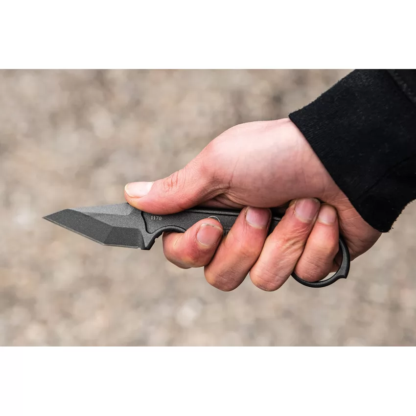 6.63" overall. 2.38" blade. Finger ring. Glass breaker. One piece black river wash 1095HC steel construction. Black Kydex neck sheath. Bulk packed.