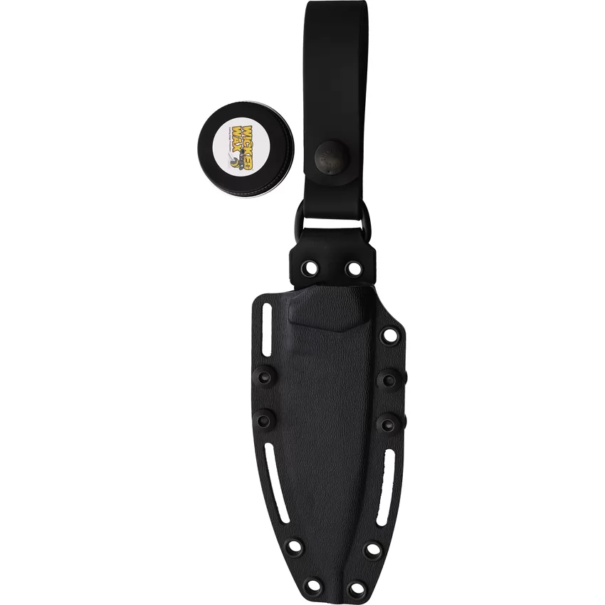 9.75" (24.77cm) overall. 4.25" (10.8cm) tumbled finish CPM S35VN stainless blade. OD green canvas micarta handle with orange liners. Full, extended tang. Lanyard hole. Thumb pull. Includes small tin of Wicked Wax. Black Kydex belt sheath. Boxed.