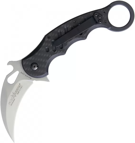 $186.95$158.95Fox FOX479CG10SW Item Description:Elevate your tactical abilities with Fox's Karambit Linerlock CF, model FOX479CG10SW. Featuring a stylish carbon fiber handle for a lightweight yet durable grip, this knife boasts a razor-sharp, GIN12 stainless steel blade with a classic karambit curve for precise and powerful cutting. Its patented linerlock mechanism ensures secure blade retention, while its reversible pocket clip accommodates both right and left-hand carry. 5.25" closed. 3" stonewash finish Bohler N690 stainless karambit blade. Thumb pull. Pocket clip. Finger ring. Extended tang. Black G10 and carbon fiber handle. Boxed.