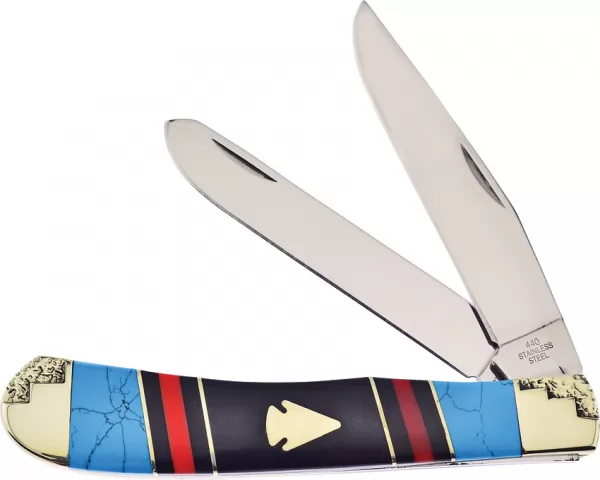 Silverhorse. 5" closed. Mirror finish stainless clip and spey blades. Nickel silver bolster(s). Inlay shield. Red, black, and turquoise stone handle. Boxed.