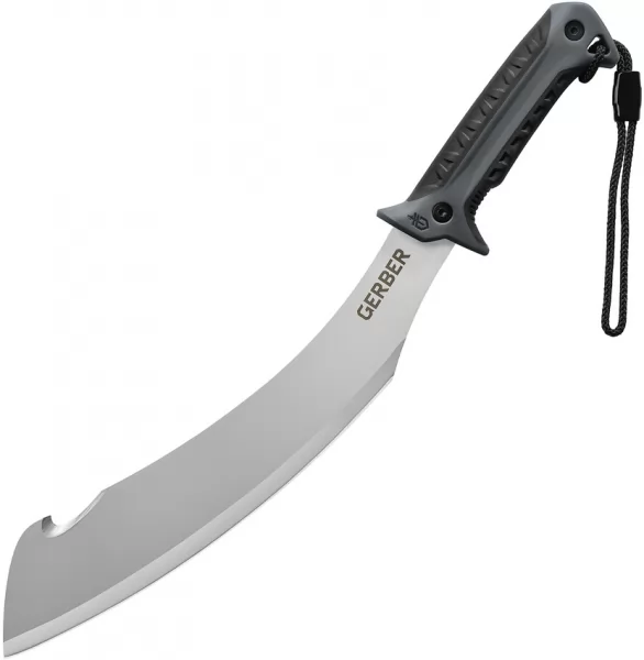 Gerber G3152 Item Description:Gerber Broadcut Machete knives - multitools G3152 on sale now for $36.98. UPC code 013658149182. Overall: 20"; Blade: 13" l Stainless l Standard Edge l Bead Blast Finish; Handle: Black l Rubber; Other Info: Angled blade with hook and cut notch. Full tang. Cord lanyard. Hang Packaged.