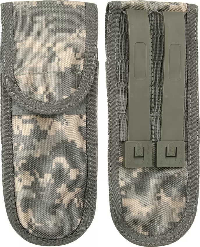 Will fit most fixed blade knives with up to a 6 1/2" blade. Could also be used for a folding saw up to 8 1/8" closed. Green and ACU camo nylon construction. Velcro closure. Back features two MALICE clips.