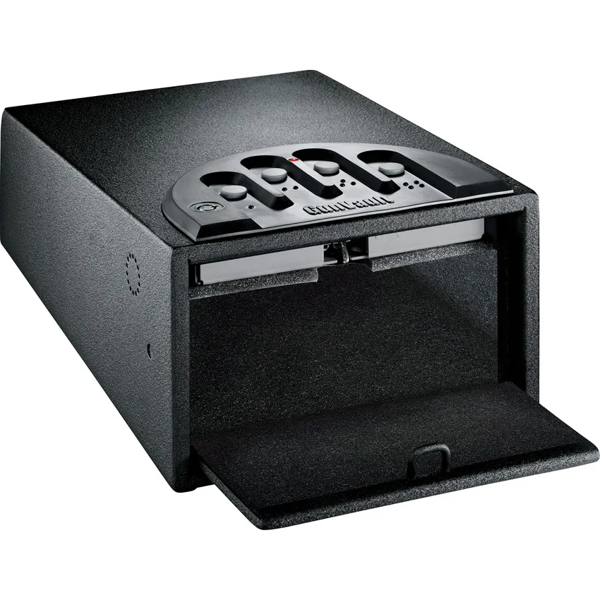 Gun Vault Minivault 1000 Standard. Measures 12 x 8 1/8" x 4 7/8". Weighs 9 lbs. 16 guage steel construction with precise fitting making it virtually impossible to pry vault open with hand tools. Soft foam liner on all interior surfaces. Built-in computer blocks access after repeated invalid keypad entries. Programmable computer lock with keylock override. Tamper indicator alerts you to invalid entry attempts. Unique No-Eyes keypad allows for quick access. Learn buttons make it easy to program over 12 million user-selectable access codes. Audio disable option adds the security of operating in silent mode. Mounts almost anywhere, in any direction. An excellent security storage system for knives also. Will hold one pistol." Measures 12" x 8 1/8" x 4 7/8". Weighs 9lbs. Will hold one pistol. 16 gauge steel construction with precise fittings make it virtually impossible to pry open with hand tools. Soft foam liner on all interior surfaces. Built-in computer blocks access after repeated invalid keypad entries. Programmable computer lock with keylock override. Tamper indicator alerts you to invalid entry attempts. Unique No-Eyes keypad allows for quick access. "Learn buttons" make it easy to program over 12 million user-selectable access codes. Audio disable option adds the security of operating in silent mode. Mounts almost anywhere, in any direction. An excellent security storage system for knives also. Guns, Jewelry, Knives, Money, etc. shown with the safes are for display purposes only. They are not included with the safes.