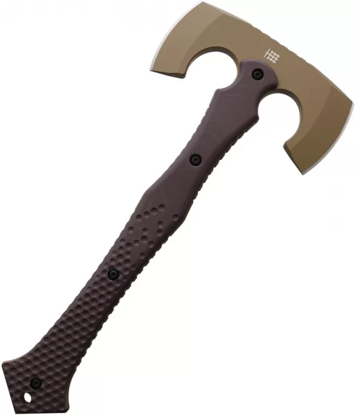 12.63" overall. 6" dark earth Teflon coated K110 tool steel axe head with 3" cutting edge. Dark Earth G10 handle. Full tang. Lanyard hole. Tan Kydex MOLLE compatible belt sheath. Boxed.