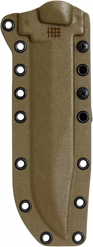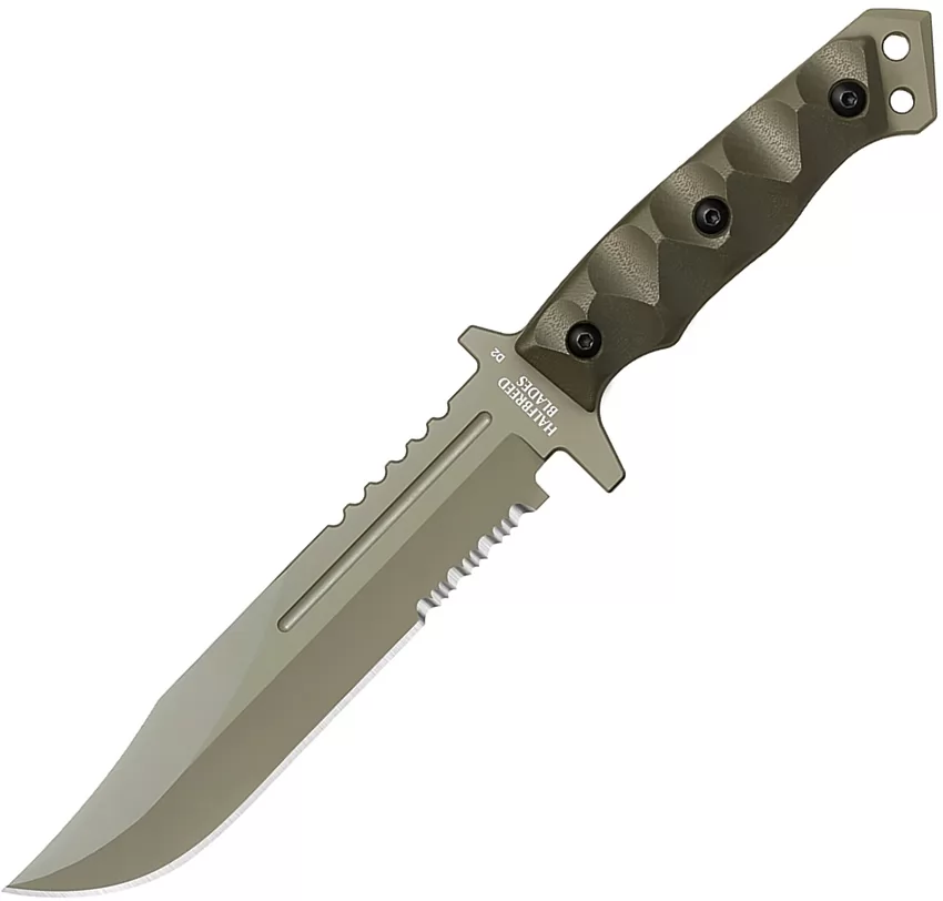 11.75" (29.85cm) overall. 6.88" (17.48cm) OD green Teflon coated partially serrated premium steel clip point blade. OD green sculpted G10 handle. Full, extended tang. Lanyard hole. Sawback blade. OD green Kydex belt sheath. Boxed.