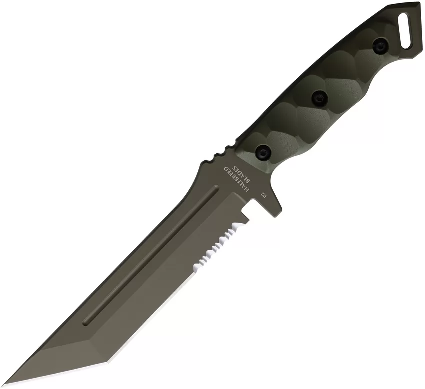 11.75" (29.85cm) overall. 6.75" (17.15cm) OD green Teflon coated partially serrated premium steel tanto blade. OD green sculpted G10 handle. Full, extended tang. Lanyard hole. Black Kydex MOLLE compatible belt sheath. Boxed.