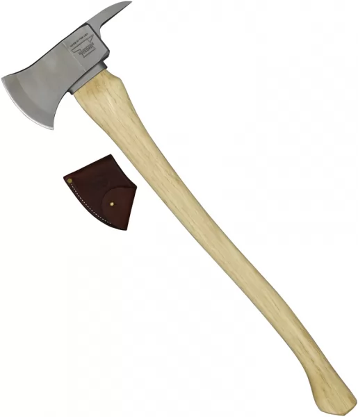 27" overall. 9" 4140 alloy steel axe head with 4" cutting edge. American Hickory handle. 2.5 lb axe head with spike end. Brown leather sheath. Bulk packed.
