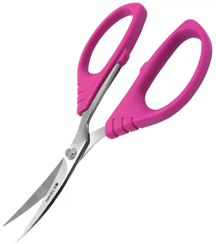 5.5" overall. Stainless blades. Pink ABS handles. Curved tips for close cutting. Durable pivot provides tight and secure cutting action. Ideal for embroidery, patchwork, appliquŽ, quilting, and sewing. ABS blade cover. Clam packed.