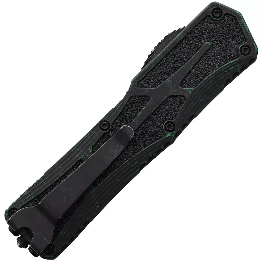 Automatic opening. 5.13" (13.03cm) closed. 3.5" (8.89cm) black stonewash finish CPM MagnaCut stainless tanto blade. Breakthrough green aluminum handle with black traction inlay. Glass breaker. Pocket clip. Boxed.
