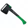 18" overall. 5.5" black coated carbon steel axe head with 2.75" cutting edge. Black and green synthetic handle. H-GRIP no-slip handle coating. Hang packaged.