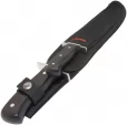 Set. Includes one 13 7/8" overall large bowie with 9 1/8" blade and one 9 7/8" overall small bowie with 6 5/8" blade. Both knives feature mirror polished stainless blades and black contoured pakkawood handles with stainless guards. Embroidered black nylon belt sheath holds both.