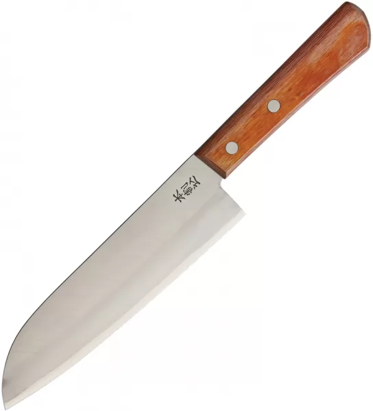 The Kanetsune BRK-KC350 Santoku knife offers exceptional performance and versatility in the kitchen. Crafted with high-quality AUS-8 stainless steel, the blade holds a razor-sharp edge, making quick work of slicing, dicing, and mincing. Its ergonomic Pakka wood handle provides a comfortable and secure grip, promoting precision and control. This balanced and beautifully designed knife will become an indispensable tool for any home chef seeking professional-grade results. 11.25" overall. 6.5" satin finish blade. Blade features Takefu-Shiro-2 high carbon steel core, sandwiched between SUS410 stainless steel. Red plywood handle. Boxed.