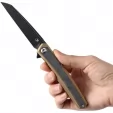 4.5" (11.43cm) closed. 3.5" (8.89cm) black stonewash finish CPM S35VN stainless Wharncliffe blade. Gold anodized titanium handle with black micarta inlay. Extended tang. Pocket clip. Black nylon pouch. Boxed.