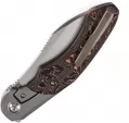 4.5" (11.43cm) closed. 3.5" (8.89cm) stonewash finish CPM-20CV stainless Wharncliffe blade. Gray titanium handle with Copper foil carbon fiber onlay. Pocket clip. Extended tang. Black nylon pouch. Boxed.