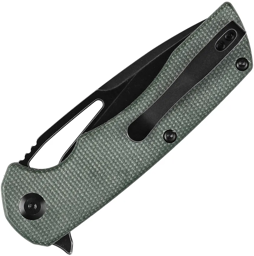 4.5" (11.43cm) closed. 3.5" (8.89cm) black stonewash finish 12C27 Sandvik stainless blade. Green canvas micarta handle. Thumb pull. Pocket clip. Extended tang. Black nylon pouch. Boxed.