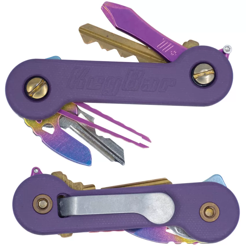3.5" overall. Purple G10 construction. Tools include: Pocket clip and Key fob. Screws included (to hold 4, 8, or 12 keys). Load keys in preferred order. O-rings keep keys snug and allow for adjustment of tension. Washers between keys for easy deployment. Includes link for key fob. Holds up to 12 keys. Keys and accessories not included. Hang packaged.
