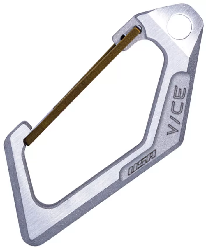 2.75" overall. Sandblast finish titanium construction with bronze gate. Large enough to fit key fobs and any accessories you need to keep together. Lanyard hole. Not for climbing. Vice Hardware collaboration. Gift tin.