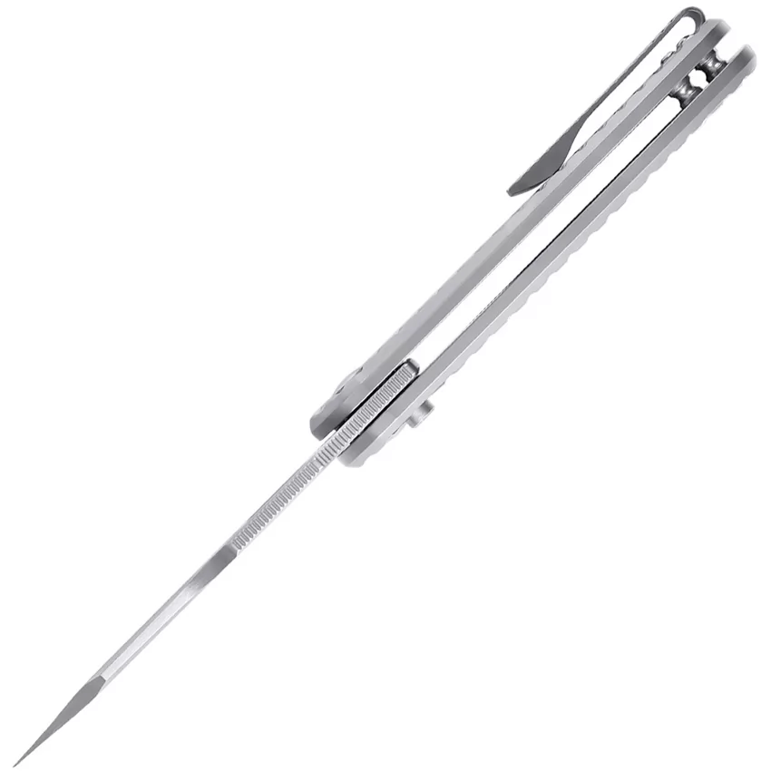 4.13" (10.49cm) closed. 3.25" (8.26cm) satin finish CPM-20CV stainless blade. Gray sculpted titanium handle. Extended tang. Thumb pull. Pocket clip. Black nylon pouch. Boxed.