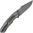 4.13" (10.49cm) closed. 2.98" (7.57cm) stonewash finish S90V steel harpoon style blade. Gray titanium handle with Toxic Storm Fat carbon fiber inlay. Thumb stud. Pocket clip. Boxed.
