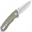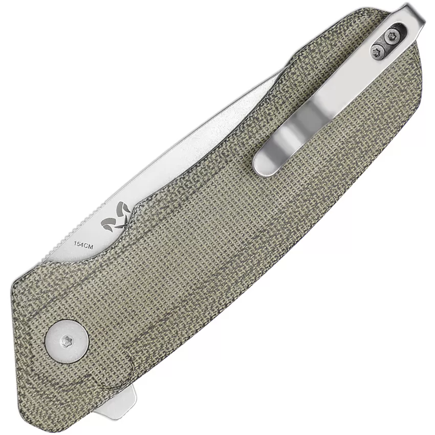 5" (12.7cm) closed. 3.5" (8.89cm) stonewash finish 154CM stainless tanto blade. Green canvas micarta handle. Extended tang. Pocket clip. Boxed.