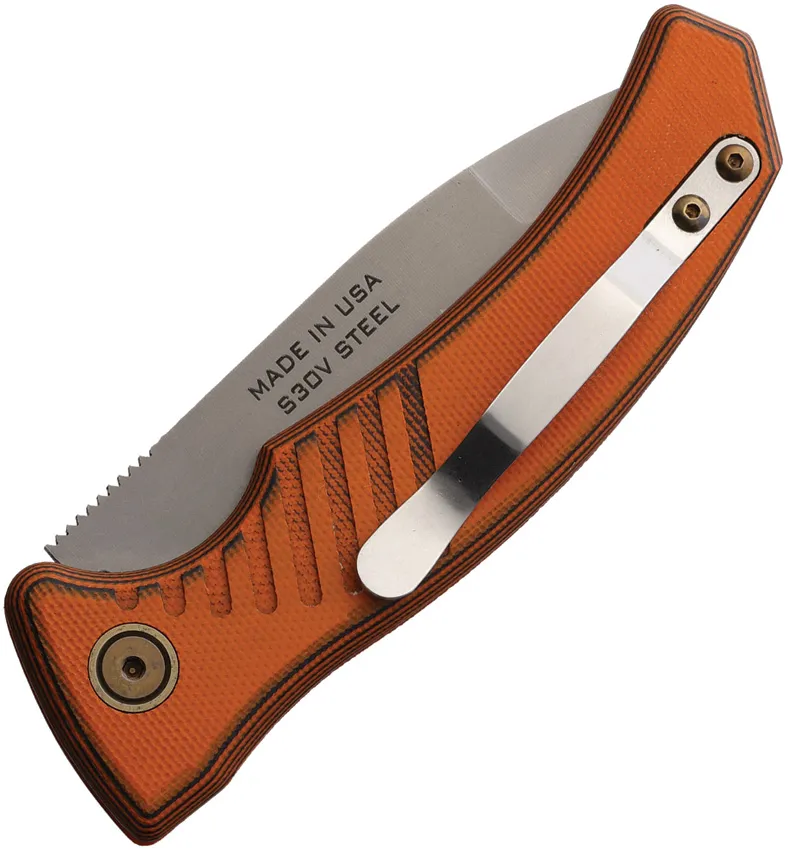 Automatic opening. 4.25" (10.8cm) closed. 3.25" (8.26cm) bead blast finish S30V stainless blade. Black and orange G10 handle. Pocket clip. Boxed.