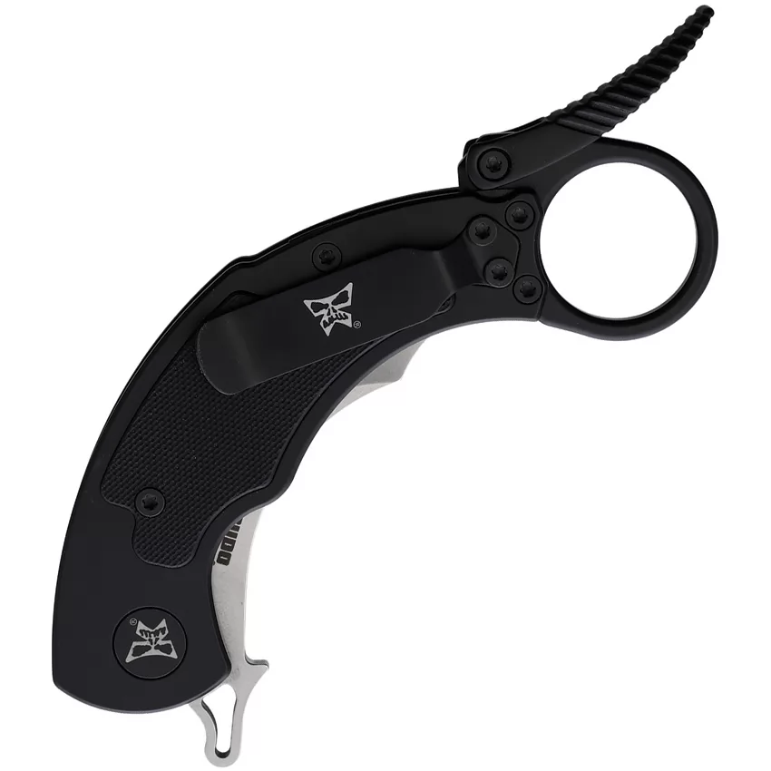 5.25" (13.34cm) closed. 3" (7.62cm) stonewash finish 9Cr18MoV stainless curved blade. Black stainless handle with black G10 inlay. Pocket clip. Finger ring. Extended tang. Lanyard hole. Boxed.