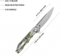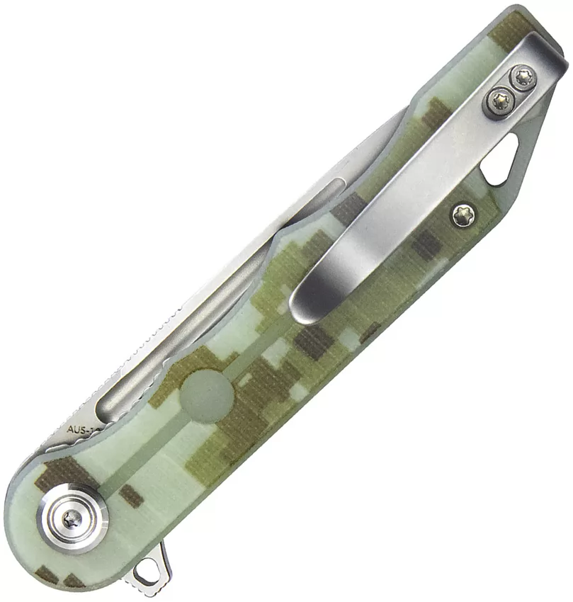 4" (10.16cm) closed. 3.13" (7.95cm) stonewash finish AUS-10A stainless blade. Camo G10 handle. Extended tang. Lanyard hole. Pocket clip. Boxed.