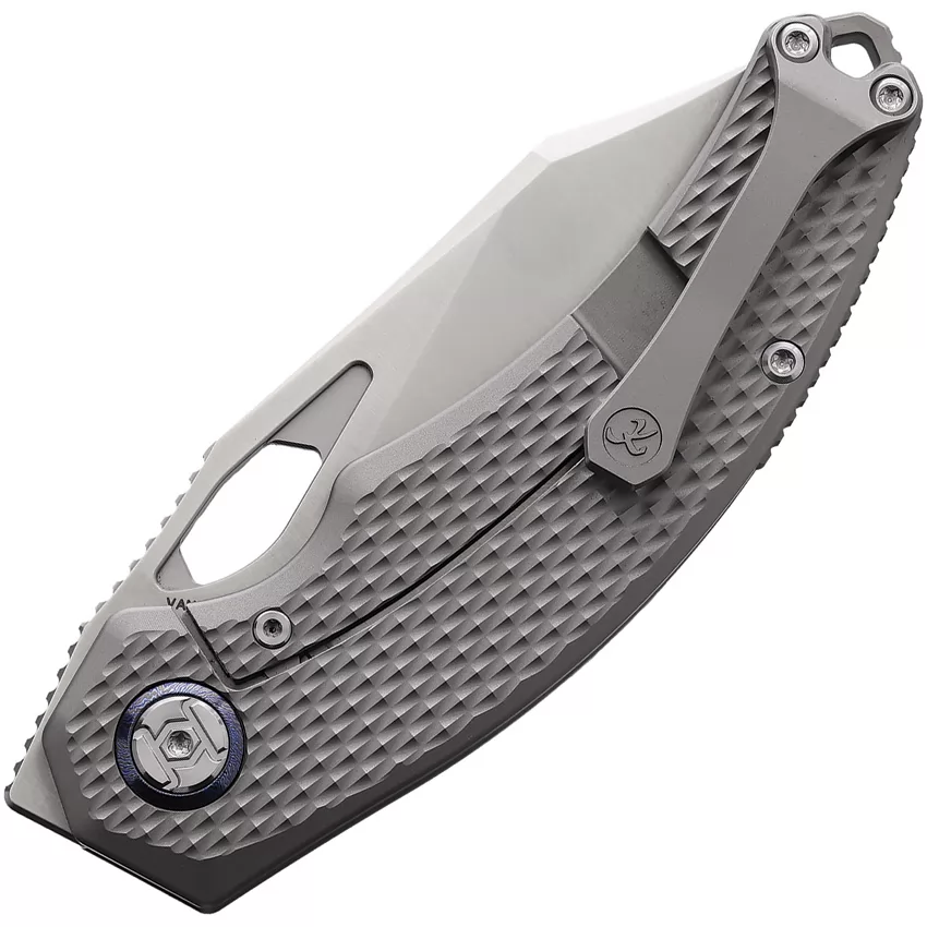 4.75" (12.07cm) closed. 3.5" (8.89cm) satin finish blade. Satin finish titanium handle. Thumb pull. Lanyard hole. Extended tang. Pocket clip. VANAX stainless blade. Boxed.