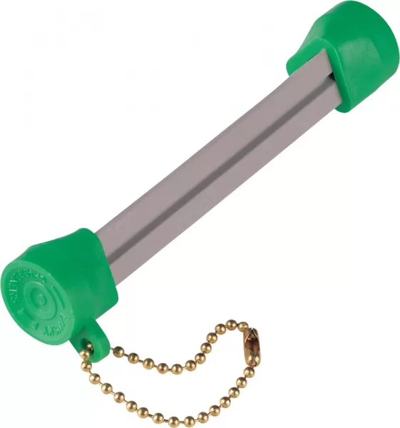 3"" overall triangular ceramic sharpener. Sharpens serrated and standard edge knife blades; multi-tools; fish hooks; axes; etc. Keychain. Hang packaged. Colors may vary.