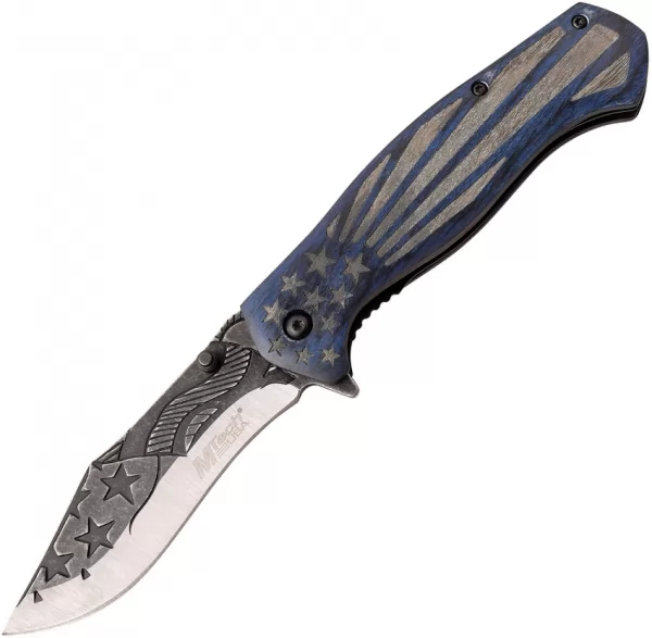 MTech MTA1157BL Item Description:The MTech knives Flag Linerlock A/O Blue (BRK-MTA1157BL) offers rapid, assisted opening in a striking package. This knife features a durable stainless steel blade secured by a reliable linerlock mechanism. The anodized blue aluminum handle provides a comfortable and secure grip, while the patriotic American flag graphic adds a touch of style. Perfect for everyday carry, the Flag Linerlock combines functionality, dependability, and eye-catching design for a tool you can count on.