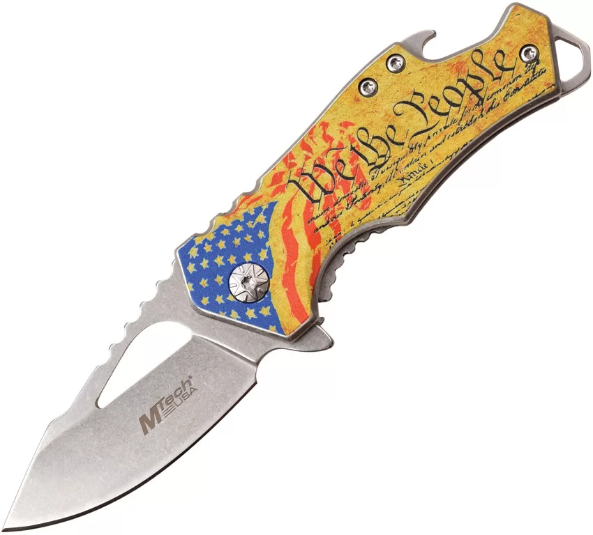 3.75" closed. 2.25" stonewash finish stainless blade. Stainless handle. Extended tang. Thumb pull. Bottle opener. Lanyard hole. Pocket clip. Gold We The People handle artwork. Boxed.