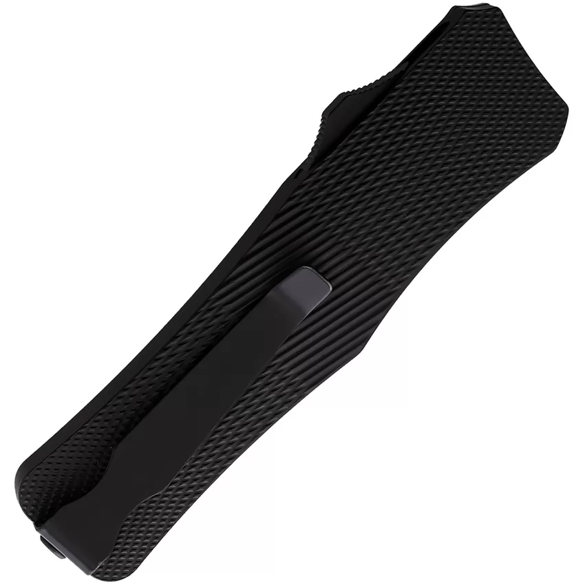 Automatic opening. 4.63" (11.76cm) closed. 3.25" (8.26cm) satin finish double edge 440C stainless stiletto style blade. Black checkered aluminum handle. Pocket clip. Boxed.