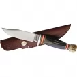 9" overall. 4.25" satin finish stainless skinner blade. Aluminum guard. Jigged horn and stag bone handle. Brown leather belt sheath. Boxed.