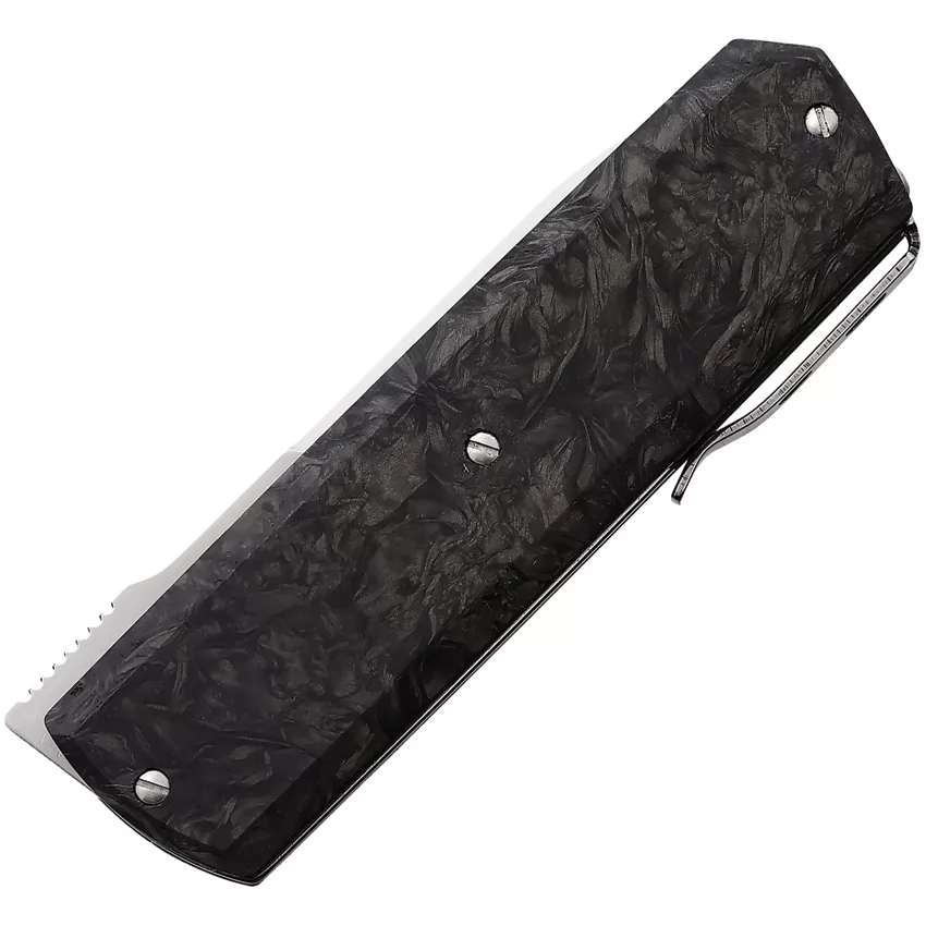 3.5" (8.89cm) closed. 2.75" (6.99cm) satin finish Elmax steel blade. Fat carbon fiber handle. Pocket clip. Extended tang. Boxed.