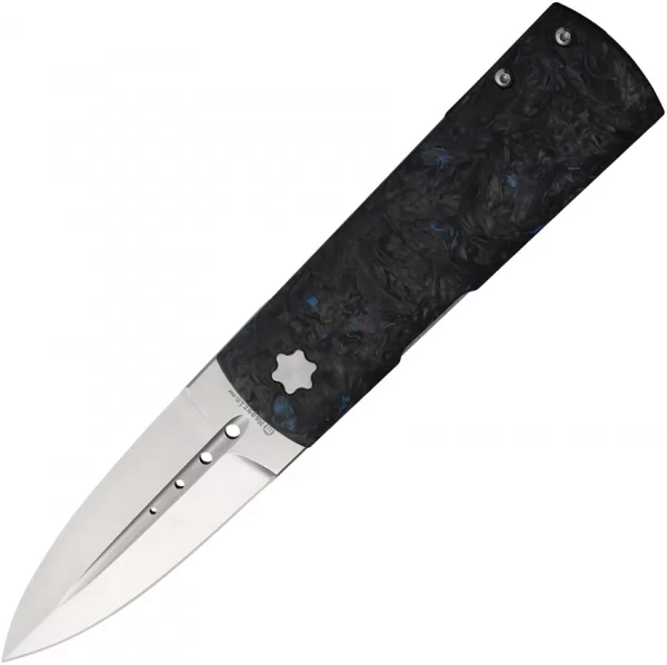 4" (10.16cm) closed. 3" (7.62cm) satin finish false edge Elmax steel dagger blade. Blue Fat carbon fiber handle with blue anodized titanium back handle. Extended tang. Black leather pouch. Boxed.