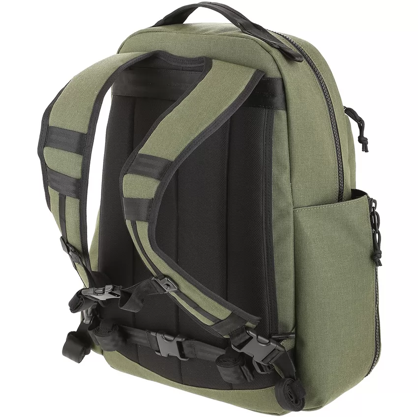 Dimensions: 19" x 17" x 8". 29L volume. Dual side accessible CCW compartment. Expandable bottle holders with bungee retention. Loop field on front for morale patches. Internal organization pockets. Curved and padded shoulder straps. Field replaceable side release buckles. YKK molded tooth zippers. Semi-rigid, flexible internal frame system with aluminum stay. 1000D nylon construction. Color: OD Green. Bulk packed.