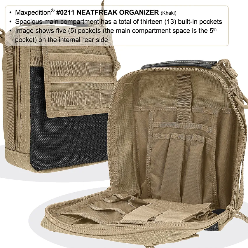 Maxpedition NeatFreak Organize Organizer. Khaki. 9 1/2 x 7 1/2" x 3" closed. 1 1/2" shoulder strap with pad. 18 pockets. Front features a web pocket, with a fold-over lid that has an additional zippered pocket plus two rows of PALS webbing for attachment of a Maxpedition pocket or sheaths for increased carry capacity. In the back, there is an additional slip pocket with modular Velcro flaps to secure the NeatFreak onto a backpack, leg rig, or tactical vest. A tri-directional carry handle allows user to hold on to this pack from multiple directions or simply throw over one's shoulder using the shoulder strap. Color: Khaki." Legacy Series. Dimensions: 8" x 3" x 11". Main compartment has thirteen built-in pockets, with a Velcro divider that has three additional pockets. The front is a web pocket, with a fold-over lid that has an additional zippered pocket plus two rows of PALS webbing. Additional slip pocket with modular Velcro flaps to secure onto a backpack, leg rig, or tactical vest. Tri-directional carry handle. Color: Khaki. Bulk packed.